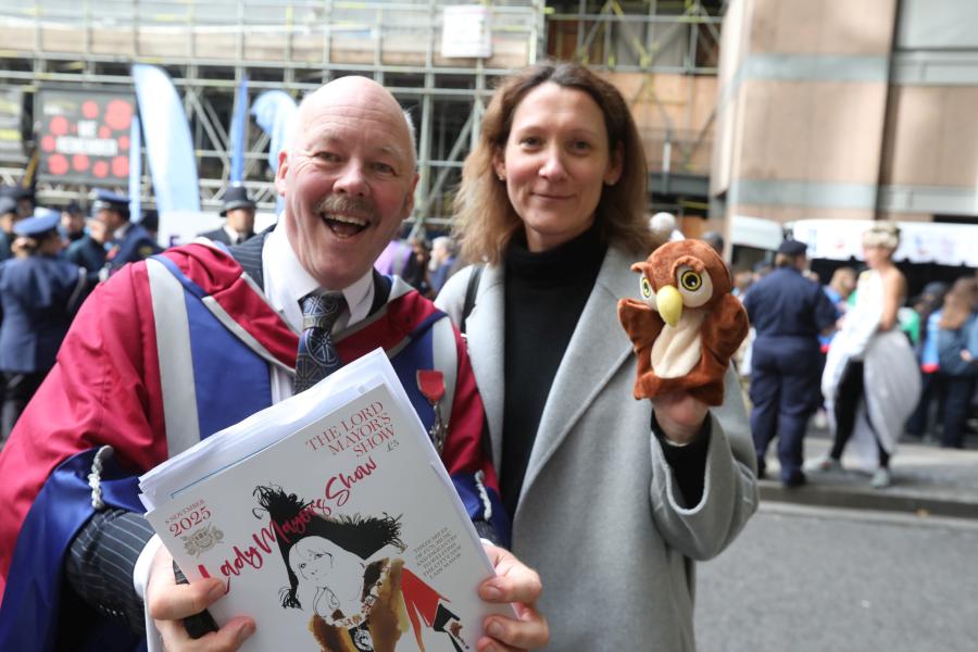 Carnival impact as giant owl represents knowledge, learning and delivery for a final mile at Mansion House for the 2025 Lady Mayor's Show.