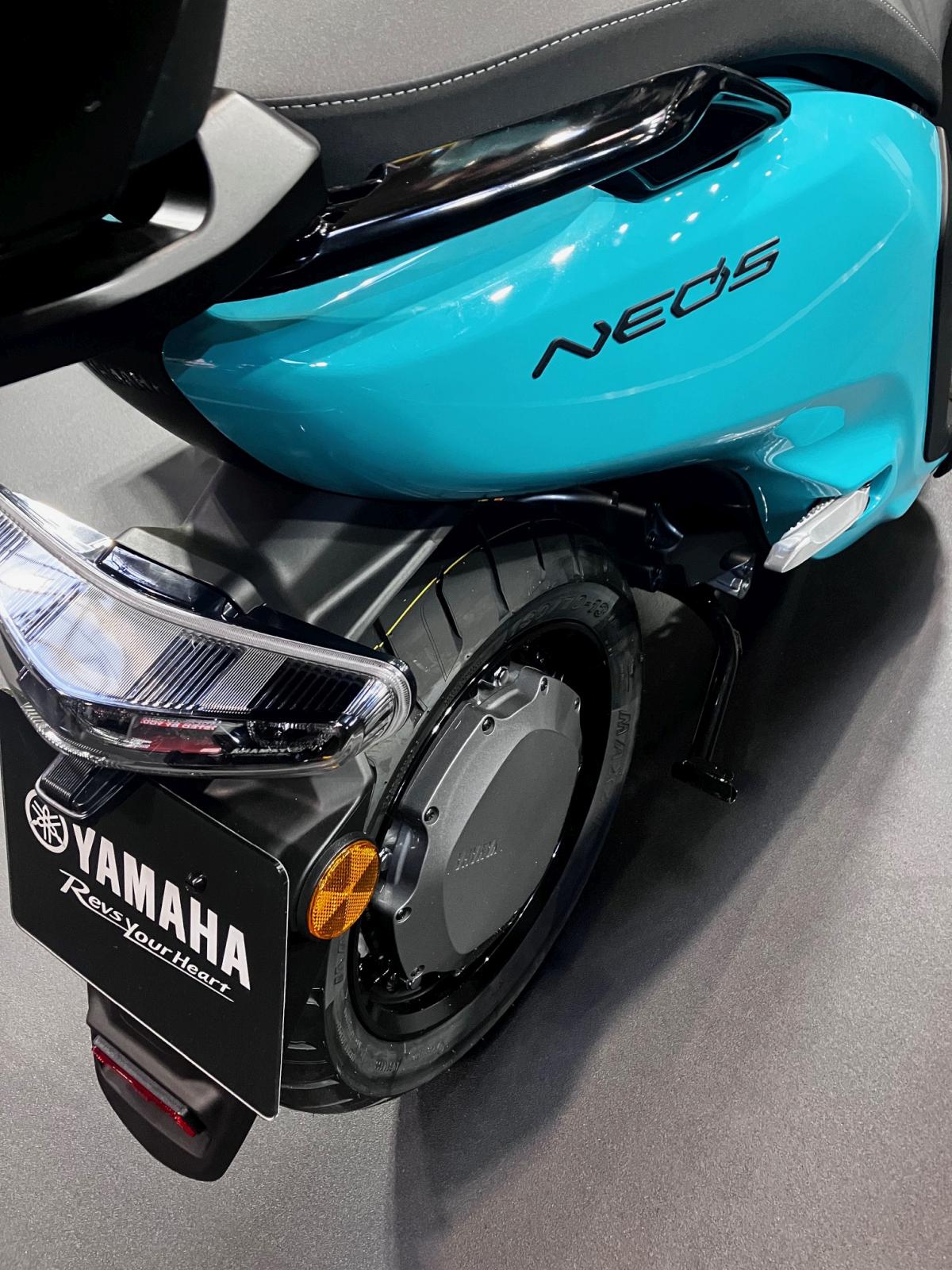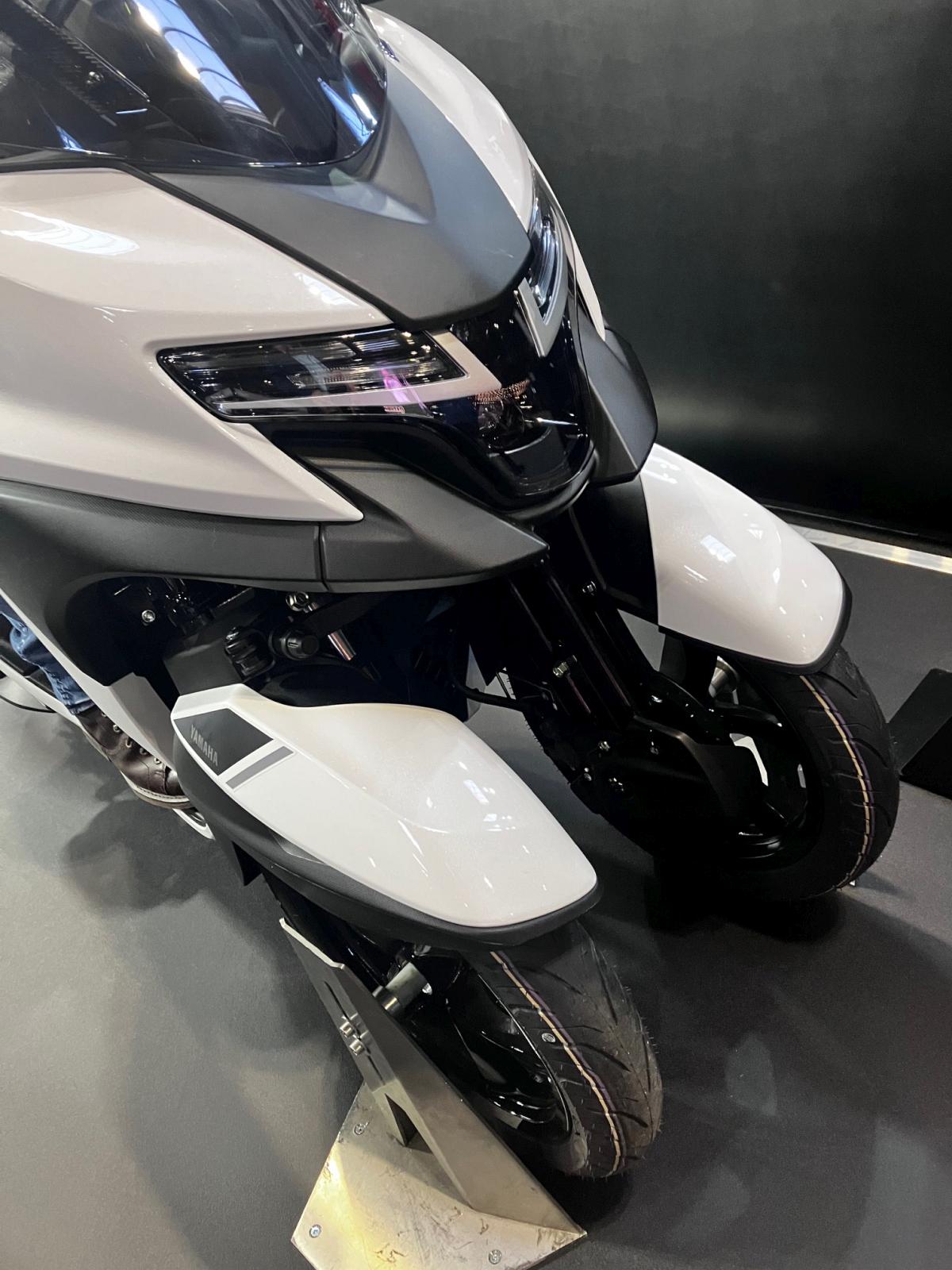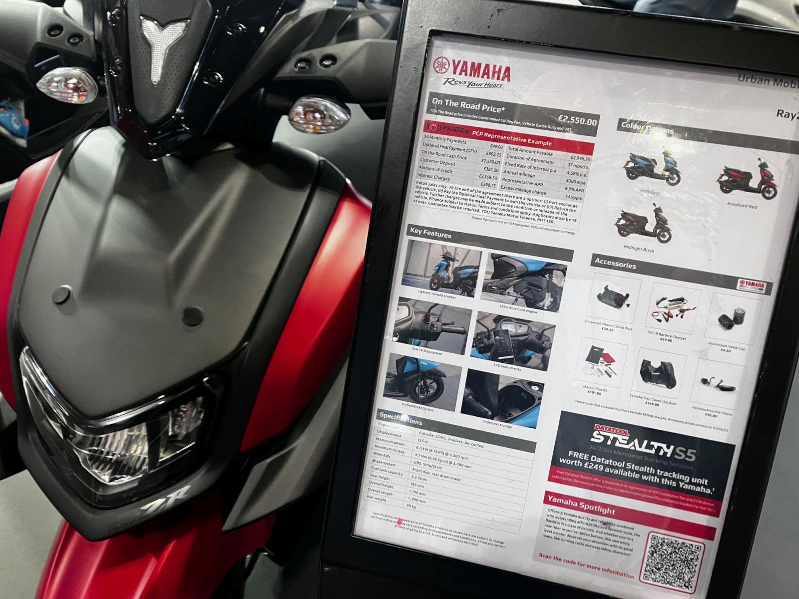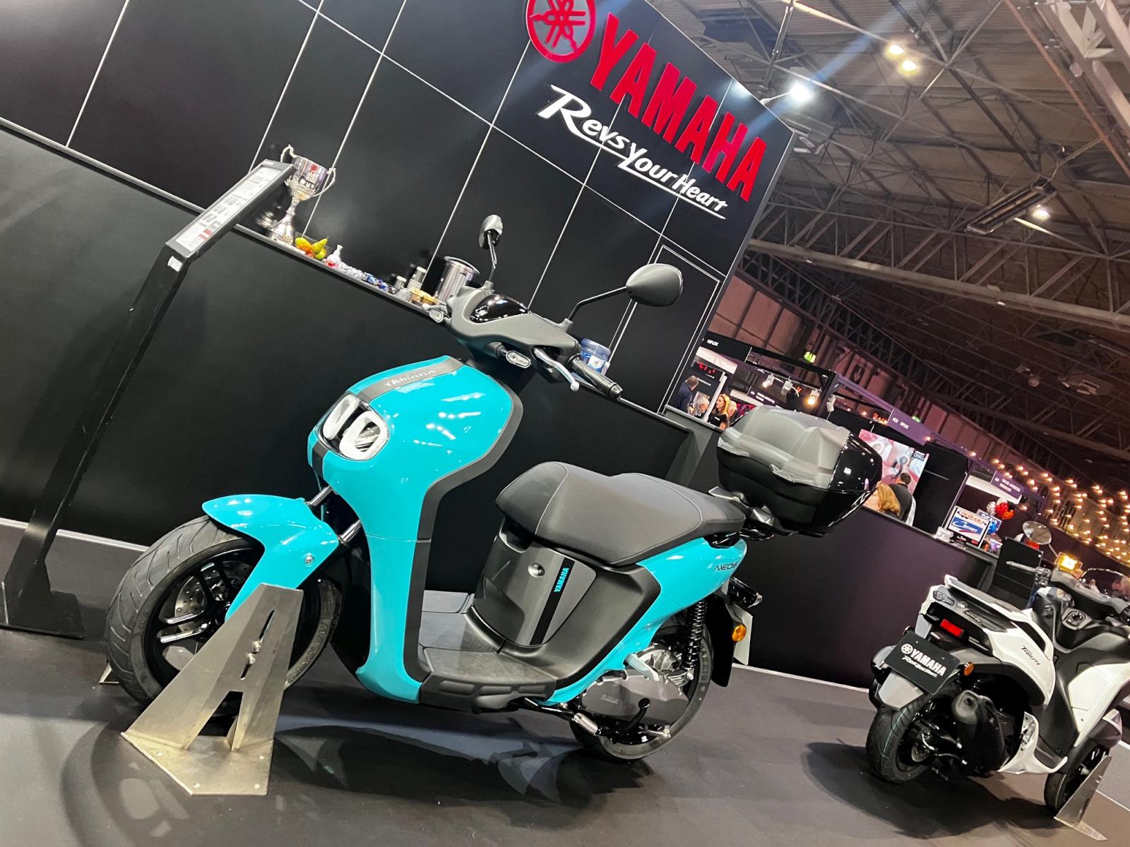 Yamaha electric 100 delivery scooter stood on stage resplendent in clean air final mile, fresh from duty on the express delivery to the Lady Mayor's Show; BBC showcase of clean air final mile courier duty in the Square Mile of the City of London.